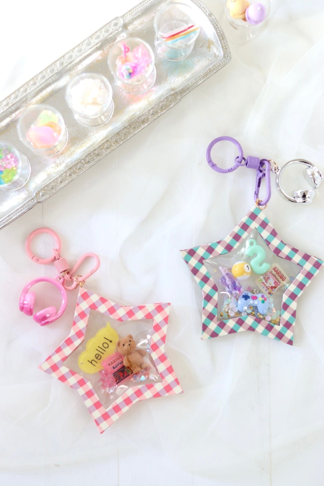 お気に入りのチャームやおもちゃを詰めた星のキーリングを作ります。