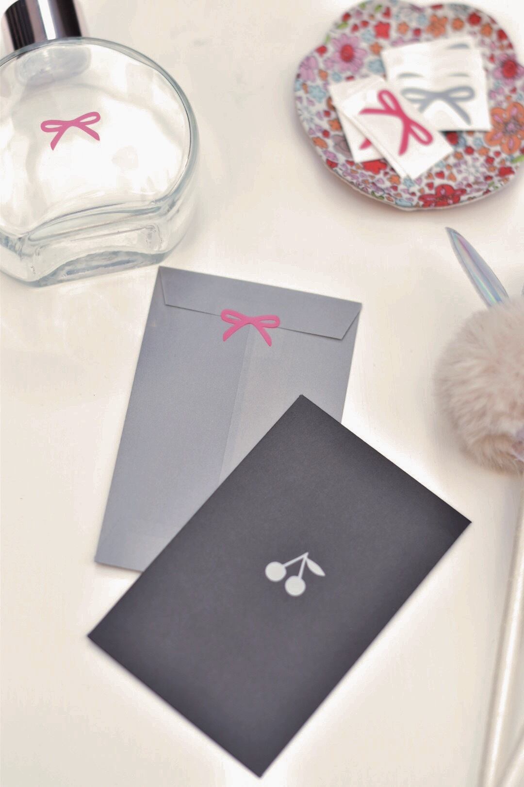 さくらんぼ、リボンの形にカットしたステッカーです。マットなピンクとグレー。